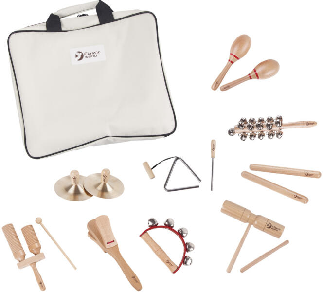 A híres Classic World márka hangszerkészlete tökéletes termék a gyermeke számára. Ez a játék segít fejleszteni gyermeke kézügyességét és hallását, valamint erősíti természetes ritmusérzékét. A készlet kilenc hangszert tartalmaz, amelyek a mindennapi játék szerves részét képezik. Utazáshoz is tökéletes, mivel praktikus hordtáskában kapható. Tulajdonságok: