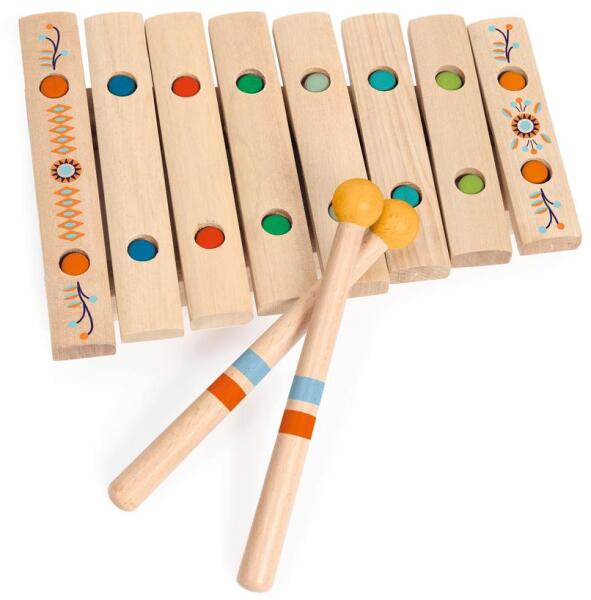 Djeco Animambo gyerek hangszer - 8 hangjegyes xilofon 3 éves kortól A xilofon egy különböző hosszúságú falemezekből álló ütőhangszer, melynek egyik jelentése: "zenélő fa". A Djeco Animambo sorozatának újabb tagja már kiskortól fejleszti a zenei készségeket, ritmusérzéket, kézügyességet. A játék xilofon érdekessége, hogy a különböző falemezeken különböző színű jelzés található, így a készlethez tartozó "színkotta" segítségével a gyerekek könnyen elsajátíthatják a dallamokat. A játék hangszer otthonra és ajándéknak is ideális. A termék csomagolásán található QR-kód segítségével megismerhetjük a xilofon hangzását. FSC tanúsítvánnyal rendelkező fából készült termék. Tartalma:   < ul>