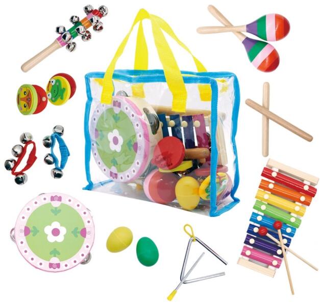 Hagyja kibontakozni gyerekei  zenei tehetségét,   egy nap talán híres  zenész vagy zeneszerző  vállik belőlük. Ezzel a készlettel kiválaszthatja azt a  hangszert, amelyik a legjobban tetszik neki.   A hangszerek  főként fából készültek.   A gyerekekek bárhová magukkal vihetik a hangszereket az  átlátható táskának  köszönhetően, ami a készlet része. Tulajdonságok: - 3 éves kortól - a játékok fejlesztik a kézi és motorikus képességeket - 14 db hangszer táskával - Bizonylatok: CE, EN71, SGS A készlet 14 db hangszert tartalmaz: - cintányérok - csörgődob -  rumba golyó 2x - kasztanyetta 2x - rumba tök 2x - csengettyűk  - triangel - csörgettyű 2x A montessori játékok kiválóak éppen azért, mert figyelembe véve a gyerek természetes fejlődését, feltűnés mentesen oktatnak. Tudjon meg többet róluk tanácsadásunkban:  Montessori játékok: Hogyan és miért működnek?