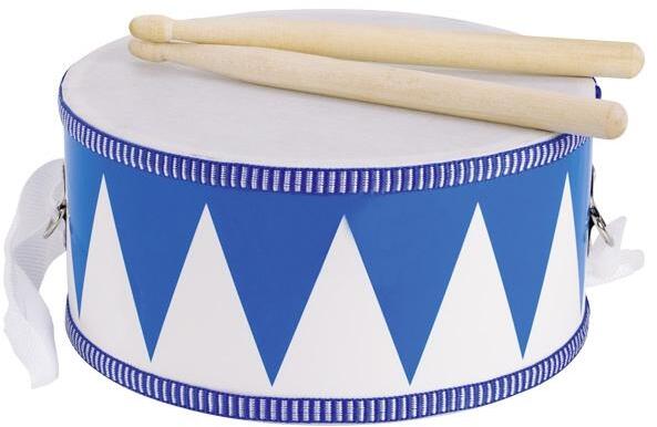 Nyakba akasztható kék-fehér fa dob és 2 darab fa ütő. A heveder biztonsági zárral rögzíthető, könnyen eltávolítható szükség esetén a dobról, hossza állítható. A dobolás fejleszti a ritmusérzéket és a motorikus képességeket.  A hordozható kék-fehér csíkos fa játék do b jellemzői: