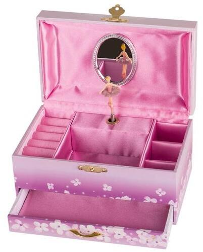 Minden kislány álma: egy elegáns rózsaszín virágokkal díszített ékszerdoboz hajcsatoknak, szalagoknak és ékszereknek. Amikor felnyílik a dobozt, a balerina táncolni kezd a Hattyúk tava klasszikus dallamára. A doboz belseje mályva színű szaténnal bélelt, külön helye van a gyűrűknek, fülbevalóknak, karkötőkenek és egy külön széles fiók a nyakláncoknak. A doboz fedele biztonságosan rögzíthető a fém csatnak köszönhetően.