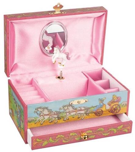 Minden kislány álma: egy elegáns ékszer doboz hajcsatoknak, szalagoknak és ékszereknek. Amikor felnyílik a dobozt, a felágaskodó hófehér, aranypatás ló forogni kezd a Hattyúk tava klasszikus dallamára. A doboz fedele biztonságosan rögzíthető a fém csatnak köszönhetően.