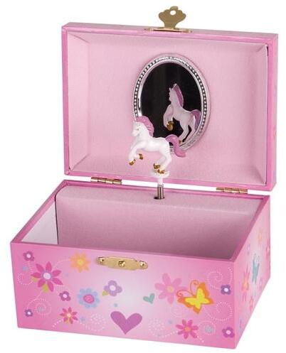 Minden kislány álma: egy elegáns ékszer doboz hajcsatoknak, szalagoknak és ékszereknek. Amikor felnyílik a dobozt, a felágaskodó hófehér unikornis forogni kezd a Hattyúk tava klasszikus dallamára. A doboz fedele biztonságosan rögzíthető a fém csatnak köszönhetően.