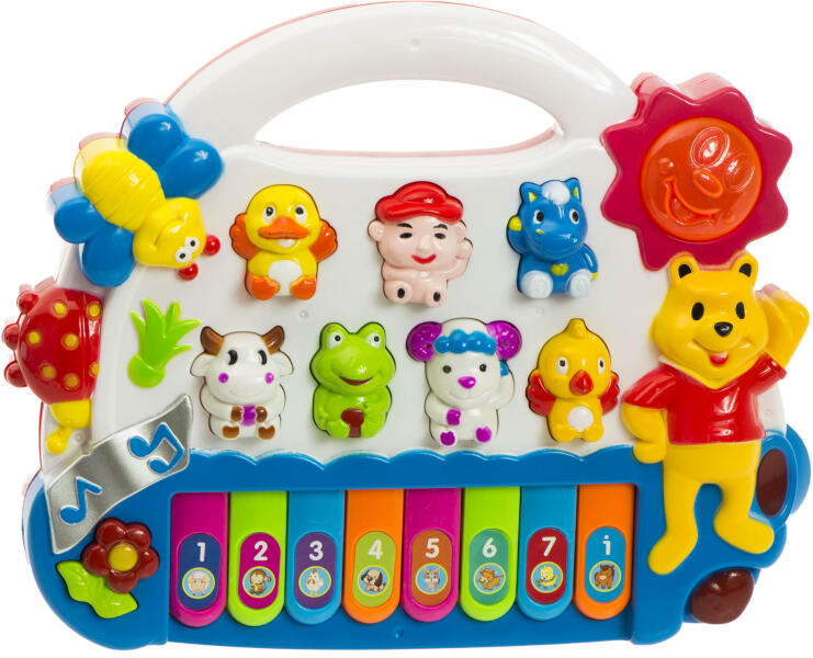 Interaktív zongora gyerekeknek. A kiválasztott módtól függően a zongora skálát, dallamokat vagy állathangokat játszik. A nap a billentyűk megnyomásakor világít.