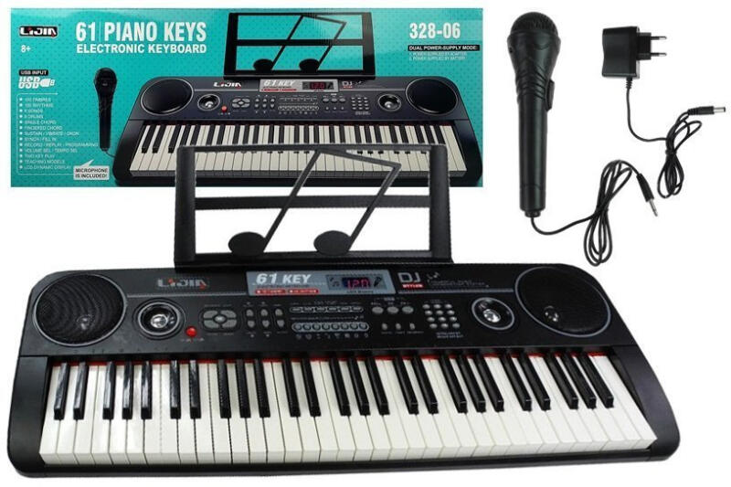 Ha gyermeke arról álmodik, hogy zenész lesz, tökéletes választás a számára. Ez a játék szintetizátor USB bemenettel rendelkezik, amelynek köszönhetően feltöltheti saját zenéit. Gyönyörű fekete színben készült. A készlet további előnye a mikrofon. A szintetizátor rendelkezik:- 61 billentyű- 100 tónusú színek- 100 kész ritmus- 8 ütőhangszeres billentyű - lehetőség felvételek és háttérsávok létrehozására- felvételi/lejátszási rendszer - tempóbeállítás- DEMO sávok- hangerőszabályzó- SZTEREÓ 2 CSATORNÁS HANGSZÓRÓKKAL- LED kijelző- Energiaellátás: mellékelt töltő vagy 6 x 1,5 V AA elem (nem tartozék)- mikrofonbemenet (miniJACK bemenet)- USB bemenet (külső csatlakozás)- lejátszó vagy telefon csatlakoztatására (miniJACK)- Line out pl. fejhallgató vagy külső hangszóró csatlakoztatására (miniJACK)- puha billentyűkA készlet a következőket tartalmazza:- szintetizátor- Tápegység- Mikrofon - Kotta állványBillentyűzet méretei:80 cm x 30 cm x 8 cmCsomagolási méretek:90 cm x 34 cm x 13 cm8 év feletti gyermekek számára készült játék. A játék CE tanúsítvánnyal rendelkezik. Dobozba csomagolt készlet.