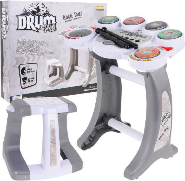 Elektromos dob szett játék gyermekeknek, mellyel igazi zenészek lehetnek. A szett tartalmaz 5 dob felületet és 2 dobverőt. Fel van szerelve 5 demó dallammal, hangerőszabályzóval és reset gombbal is. A dobkészlet 3 x 1,5 V AA elemmel működik, az elemeket nem tartalmazza. Felhasználói kézikönyv:Nyomja meg a "Demo" gombot, és 5 különböző demo dalt fog hallani, a konzol oldalán villogó lámpák kíséretében. Nyomja meg a ritmusgombokat (1-6), és különböző jazz ritmusokat fog hallani. Nyomja meg az 1-es vagy 2-es módot, ezekben a módokban különböző ritmusokat üthet. A hangerő fel és le gombja a hangerő beállítására szolgál. Nyomja meg a "Stop" gombot minden leállításához és újraindításához. Jellemzői:- 6 dob ritmus, - 5 dallamdemó, - hangerőszabályzó gomb, - reset gomb,