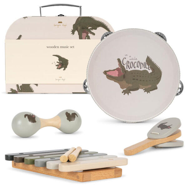 Kis bőrönd fa hangszerekkel apró zenészeknek. A szett 6 darabot tartalmaz: