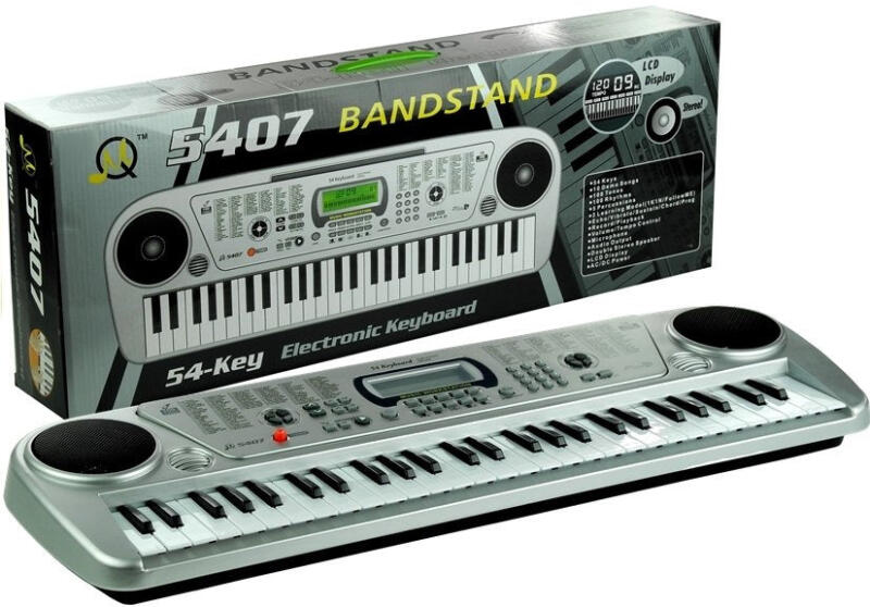 Ezüst billentyűzet MQ5407 mikrofonnal Az orgonák és más multifunkcionális hangszerek olyan játékok, amelyek kellemesen fejlesztik a gyermekek művészi lelkületét és zenei szenvedélyét, emellett pozitív hatással vannak a motoros koordinációra, türelemre és koncentrációra. A billentyűs hangszereken való játék megtanulásával a gyermek megtanulja, hogy szisztematikusan és a céljai elérésére törekedjen. A bemutatott billentyűzet erősíti a kisgyermek ritmusérzékét és hallását. A billentyűzet 54 billentyűből , valamint számos gombból áll, amelyekkel aktiválható:- 10 dalból 1, - 100 különböző billentyű, például templomi orgona, rock, harmóniák, bendzsó, jazz, - 100 különböző ritmusból 1 ? többek között blues, twist, pop, shuffle, - 5 féle ütőhangszer, - 2 tanulási mód, - hangok felvétele és lejátszása, - hangerő- és tempószabályozó gomb. Miért válassza ezt az orgonát? Ezek szenzációsak! A könnyű kialakításuk lehetővé teszi, hogy a játékot magaddal vihesd és asztalra vagy íróasztalra helyezd, így gyermeked az otthon bármelyik sarkában megrendezheti a műsorokat. A billentyűzet két, nagyméretű sztereó hangszóróval van felszerelve, így megfelelően hangos az otthoni környezethez. Az orgona tetején egy zöld háttérvilágítású LCD kijelző található ? ez nagyon megkönnyíti a dalok, a billentyű vagy a tempó kiválasztását, így a billentyűzet intuitív használati tárgy lesz. A billentyűzet hátulján két bemenet található ? egy 230 V-os tápegység és két további hangszóró számára. Lehetőség van 6 darab AA 1,5 V-os elem behelyezésére, amelyek nem tartoznak a készülékhez. A hangszer CE biztonsági tanúsítvánnyal rendelkezik, és minden 3 év feletti gyermek számára alkalmas. Eredeti dobozában van csomagolva, így ajándéknak is tökéletes. Sokoldalú ezüst színe és áramvonalas formája biztosan játékra ösztönzi gyermekét. A billentyűzet méretei : - 60 cm x 20 cm. A csomagolás méretei : - 63 cm x 23 cm x 10 cm. .