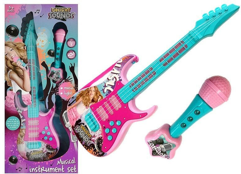 GITÁR MIKROFONOS KARAOKE SZETT A tökéletes szett a kis művésznek, aki arról álmodik, hogy színpadon lépjen fel és megtegye első lépéseit a zene világában! A mikrofonnal ellátott gitár nagyszerű azoknak a gyerekeknek, akik szeretnek énekelni, játszani és közönség előtt fellépni. Ennek a készletnek köszönhetően minden gyermek igazi zenei sztárnak érezheti magát, miközben fejlesztheti ritmikai és éneklési készségét, valamint kreativitását. A fantasztikus gitárt a legfiatalabb zenészek igényei szerint terveztük ? könnyű, kényelmes a fogása és modern dizájnnal rendelkezik. Játék közben a gitáron és a mikrofonon is villogó fények aktiválódnak, így a játékidő még vonzóbbá és magával ragadóbbá válik. A készlet legnagyobb előnye a mellékelt mikrofon, amely lehetővé teszi a karaoke-éneklést. Lehetővé teszi, hogy gyermeke elénekelje kedvenc dalait, gyakorolja a hangját és fejlessze zenei készségeit. A mikrofon tökéletes méretű a kis kezek számára, így könnyen kézbe vehető és kényelmesen használható. A készlet tökéletes ajándék lesz minden zenekedvelő gyermeknek. Bátorítja a kreatív játékot, növeli az önbizalmat, és bevezeti őket a ritmus és a hangok világába. SPECIFICATION: . Játék célja_ a zenei készségek, a ritmus, a kreativitás és az önbizalom fejlesztése . Fényhatások: villogó fények a gitáron és a mikrofonon . Karaoke funkció_ lehetőség a mikrofonba énekelni A gitár áramellátása_ 3 db AA elem? 1,5V (nem tartozék) . Mikrofon tápellátása_ 2 db ?AA? 1,5V (nem tartozék) . A gitár méretei_ 65 cm x 21 cm x 5.5 cm Mikrofon méretei_ 21 cm x 7 cm x 6 cm Pack méretei_ 72 cm x 28 cm x 6,5 cm A csomag tartalma_ . Gitár fényeffektekkel Mikrofon a karaoke-hoz
