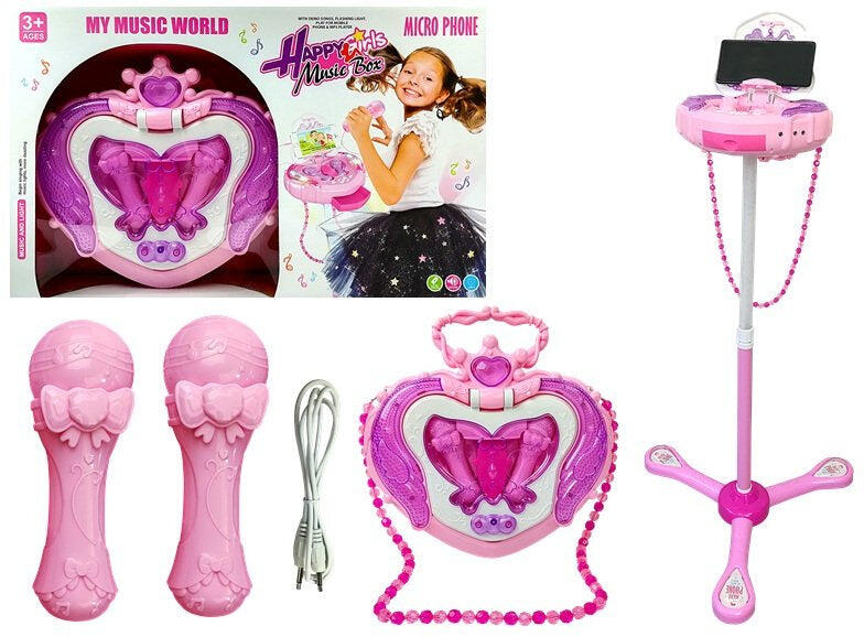 Stand Music Box mikrofon hangszóró rózsaszín Köszöntsd a maga nemében első koncerten! Az Ön csemetéje lesz az, aki ma meglepi a közönséget egyedi repertoárjával, a rózsaszín gyermek állványos mikrofonok segítségével. A zene jelenléte rendkívül pozitív hatással van minden gyermek megfelelő fejlődésére. Ha csemetéd már az első évektől kezdve érdeklődést mutat a játékok iránt, könnyítsd meg számára a további játékot és a zenei érdeklődés fejlesztését azzal, hogy beszerzed neki ezt az egyedi karaoke mikrofont. Egy ilyen játék tökéletes ajándék minden olyan kis művésznek, aki szeret énekelni és fellépni az otthoni színpadon. A készletet úgy tervezték, hogy egyszerre több szinten is ösztönözze gyermeke fejlődését. A multifunkcionális játék egyszerre fejleszti a kiscsillag hallását, zenei és ritmikai képességeit, ami tovább támogatja a képzelőerejét, koncentrációját és motoros koordinációját. A masszív kivitelezés és az élénk, meleg színek a legigényesebb gyermek figyelmét is lekötik, és órákra lekötik. További funkciója, hogy leválaszthatja az állványról, a fő részről, és mozoghat vele, a vállára akasztva ezt a darabot. A másik funkció pedig az, hogy a készülékhez csatlakoztathatja telefonját, fejhallgatóját, és karaokézhat. Az állvány összeszereléséhez mindössze néhány egyszerű lépésre van szükség. A játék 3 perc szünet után automatikusan kikapcsol. A játék fő jellemzői_ - világító elemek - Be-/kikapcsoló -. telefontartó - 9 dal - 11 történet - 4 hang közül lehet választani - felvételi lehetőség - közönség- és tapshangok - 4 hangerőszint közül választhat - fiók - két mikrofon - állítható magasság Szerkezeti elemek_ - szív (hangszóró, koporsó) - az állvány összeállításához szükséges alkatrészek - gyöngyök - JACK-JACK kábel Az összeszerelt készlet méretei_ magasság: 80 cm - 44 cm Ülés: 25 cm x 23 cm x 7 cm Mic: 10 cm Package dimensions_ 44 cm x 27 cm x 9.5 cm A karaoke-mikrofon három 1,5 V-os "AA" elemmel működik, amelyek nem tartoznak a csomaghoz. A játék 3 évesnél idősebb gyermekek számára alkalmas. A játék CE tanúsítvánnyal rendelkezik, és megfelel az EN 71 szabványnak. Átlátszó vitrinben lévő kartondobozba csomagolva, így alkalmas ajándéknak egy gyermek számára. .