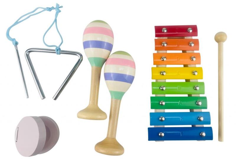 Fa hangszer szett A fa hangszer szett kiváló választás minden kis zenekedvelő számára! A természetes fa anyagból készült hangszerek biztonságosak és tartósak, miközben segítik a gyerekeket a zenei készségeik fejlesztésében. A szettben különféle hangszereket találsz, amelyek tökéletesek az első zenélős élményekhez. Ideális ajándék születésnapokra vagy bármilyen ünnepi alkalomra, ami garantáltan szórakoztató és fejlesztő játékidőt biztosít! A képen különféle fa hangszerek láthatók, amelyek egy gyerekeknek szánt hangszer szettet alkotnak. Az alábbi hangszereket tartalmazza: Triangulum – egy fém háromszög, ami ütővel használható. Maracas (rumbatök) – két darab színes, csíkos fa rázó hangszer. Xilofon – szivárvány színű, fából készült xilofon, hozzá való ütővel. Kastanyetta – egy egyszerű, kézzel összenyomható hangszer, ami ütögetve hangot ad ki.