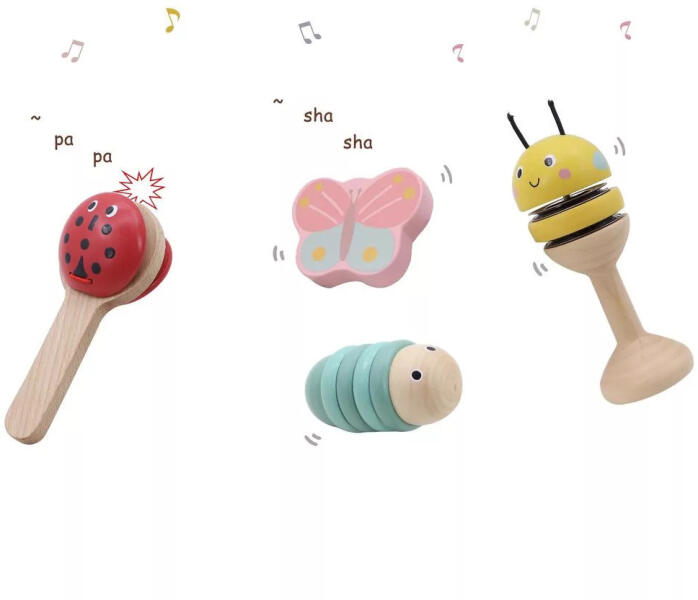 Fából készült festett ritmushangszer készlet. Lehetőséget nyújt a zenélésre olyan gyermekek számára is, akik még csak most kezdenek ismerkedni a gyerekhangszerekkel. Fejleszti a ritmusérzéket, a belső hallást, valamint a emlékező- és a alkotókészséget. Kiváló kezdőszett a közös családi zenélésekhez.