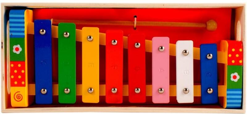 A(z) **Színes fa xilofon** – Kezdd el a zenélést a színes fa xilofonnal! A fa xilofon színes fém lapjai szépen szólnak, az ütővel egyszerűbb dallamokat és bonyolultabb dalokat is elt udsz játszani. A xilofon be van hangolva és egy oktávos hangtartományban lehet vele játszani. A bébi xilofon fejleszti a baba kézügyességét, miközben a zenei érzéke is fejlődik a játéktól. Próbáld meg lejátszan a boci boci tarkát, kis gyakorlás után garantáltan sikerülni fog! Méretek: 26 x 11 x 5 cm.