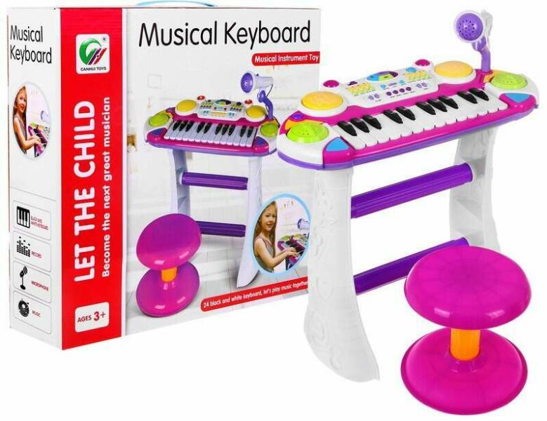 A billentyűzet fő funkciói: zenei billentyűzet skálával, hangszóró, villogó lámpakészlet, hangerőszabályozó, a ritmus lassítása és felgyorsítása, ritmus- és akkordgenerátor, kísérő rendszer, nyolcféle zenei ritmus disco, szamba, blues... , négyféle pergődob, ezenkívül nyolcféle hangszer, mint például: gitár, cselló, zongora... , hangfelvétel és lejátszás (RECORD gomb és PLAY gomb), karaoke mikrofon formájában. A zenei készlet tartalma: színes billentyűzet, billentyűzet állvány, rózsaszín széklet, fehér és lila mikrofon, mikrofon állvány, színes csomagolás, ajándéknak is tökéletes. A teljes zenei készlet méretei: magasság kb 45 cm, szélesség kb 21 cm, lábtávolság kb. 37 cm, magasság mikrofonnal kb. 58 cm, szék magassága kb 20 cm. Billentyűzet méretei: hossza: kb 45 cm, szélesség: kb. 22 cm, vastagság: kb. 7 cm, minden körülbelül 46 cm x 44 cm x 12 cm méretű csomagba van csomagolva. A játék tápegysége: A játék négy AA elemmel működik. Az elemeket a készlet nem tartalmazza. Miért érdemes zenei billentyűzetet venni? Ha úgy dönt, hogy megvásárolja ezt a játékot, gyermeke a következőket kapja: bővíti kreativitását, fejleszti a zenei képességeket, megtanulja felismerni több hangszer hangját, fejleszti a mozgáskoordinációt, erősíti az érzékszervi képességeket, aktívan eltölteni az időt játékkal.
