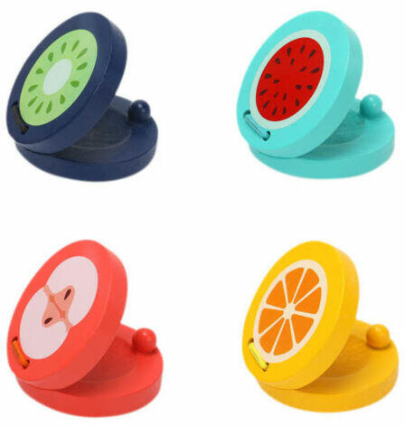 A kasztanyetta már kiskorban fejleszti a ritmusérzéket. 4 féle mintával és színben kapható: kivi - sötétkék, kivigörögdinnye - világoskék, alma - piros, narancs - sárga. Mérete: 5,5 x 2,7 cm. Anyaga: fa.