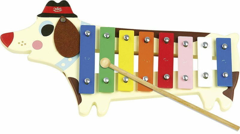 Vilac Xilofon hím Egy kutya alakú, többszínű xilofon, amelynek köszönhetően a kisebb gyerekek megtanulják felismerni a színeket, a nagyobbak pedig megtanulnak dallamokat komponálni. A csomagban egy ütővel és kottával. Illusztrálta Ingela P. Arrhenius. A Vilac játékok a francia ADEME ügynökség címkéjével rendelkeznek, ami azt jelenti, hogy ezek a fából készült játékok környezetbarát módon készülnek. Kímélik a környezetet, nem szennyezik a talajt, a vizet és a levegőt, és nem pazarolják az energiát. A VILAC magas minőségi és biztonsági követelményeket alkalmaz a játékok gyártása során mind Franciaországban, mind más külföldi országokban. Méretek: 32 x 17 x 2 cm Anyag: fa, fém Ajánlott életkor: 2+