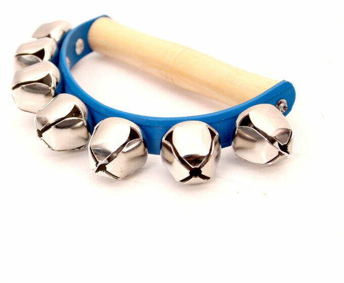 Csörgők lekerekített műanyag vázon, fa nyéllel, 7 db fém csörgővel. Méret: 16,5 x 10,5 cm