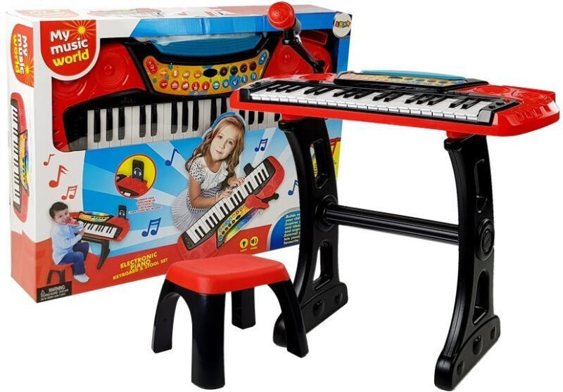 A játéknak köszönhetően gyermeke fejleszti hallását és ritmusérzékét, és talán arra inspirálja majd, hogy saját dalokat alkosson, és képes lesz kifejleszteni szenvedélyét. A készlet tartalmaz egy mikrofont tartóval, amelynek köszönhetően a gyermek egyszerre tud majd énekelni és játszani. A zongora oldalán egy fiók található egy külső MP3-lejátszó számára. Csak csatlakoztassa, és máris hallgathatja kedvenc dalait. Ez is jó indok arra, hogy karaokét vagy előadást szervezzen szerettei előtt. A tartóval ellátott mikrofon lehetővé teszi, hogy egyszerre énekeljen és játsszon. Ahhoz, hogy kényelmesen leülhessen és elkezdhesse a koncertet, a készlethez tartozik egy állvány és egy szék. A billentyűzet rendelkezik:- 37 billentyű- DEMO dalok- hangerő- és tempószabályozás- mikrofonbemenet (miniJACK bemenet)- táncritmusok típusai- 9 féle hangszerA készlet elemei:- billentyűzet- állvány-székek- mikrofonA billentyűzet mérete:55 cm x 19 cm x 4 cmMaga a mikrofon mérete:12 cm x 4 cm x 4 cmÁllvány magassága: 41 cmA szék mérete:18 cm x 14,5 cm x 18 cmA csomag mérete:57 cm x 41,5 cm x 10 cmA játék 3 évesnél idősebb gyermekek számára készült. Megfelel az EN71 szabványnak. A játék három 1,5 V-os AA elemmel működik. A legmagasabb minőségű, tanúsított anyagokból készült, és CE biztonsági tanúsítvánnyal rendelkezik.