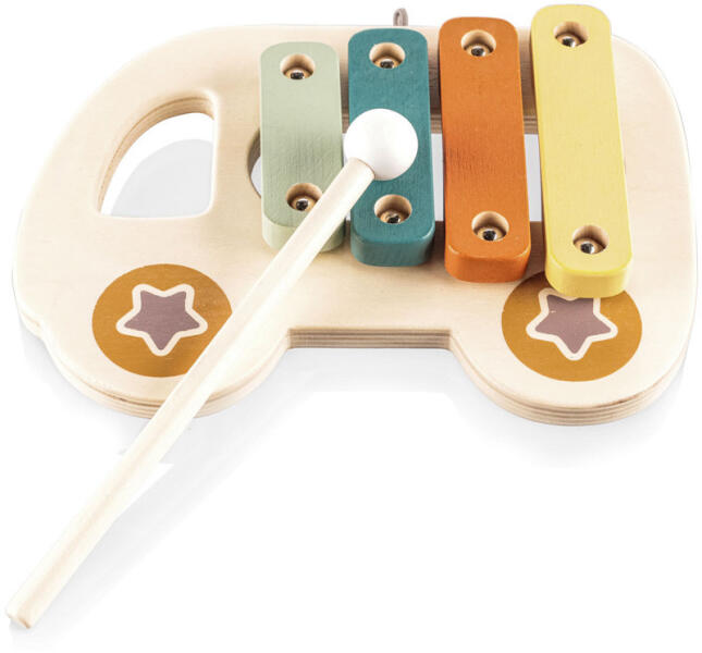 Egy aranyos, jármű alakú xilofon elsõ látásra vonzza a kíváncsi gyerekeket. Az egyszerű kompakt formát praktikus fogantyú egészíti ki, melynek köszönhetõen a játék könnyen megfogható és hordozható. A xilofon oldalára ügyesen van elhelyezve egy rugalmas gumi, amely a kalapács tárolására szolgál, és így megakadályozza annak elvesztését. A játék kompakt méretei ideálisak a kisgyermekek kezébe. Az alacsony súly garantálja a könnyű kezelést. A xilofon fejleszti a gyermek zenei hallását, aki ennek a játéknak köszönhetõen megismeri az elsõ hangokat és dallamokat. Remek eszköz a motoros készségek, a képzelet és a kreativitás fejlesztésére is. Természetes fából és vízbázisú festékekbõl készül. - 18 hónapos kortól alkalmas gyermekek számára - 4 hang - Fogantyú a könnyű hordozáshoz - Erõs gumiszalag a kalapács rögzítéséhez - Minõségi fából készült - Fejleszti a gyermekek motorikus készségeit, zenei hallását, ritmusérzékét és kreativitását - Mérete: kb. : 18 x 15 x 1cm